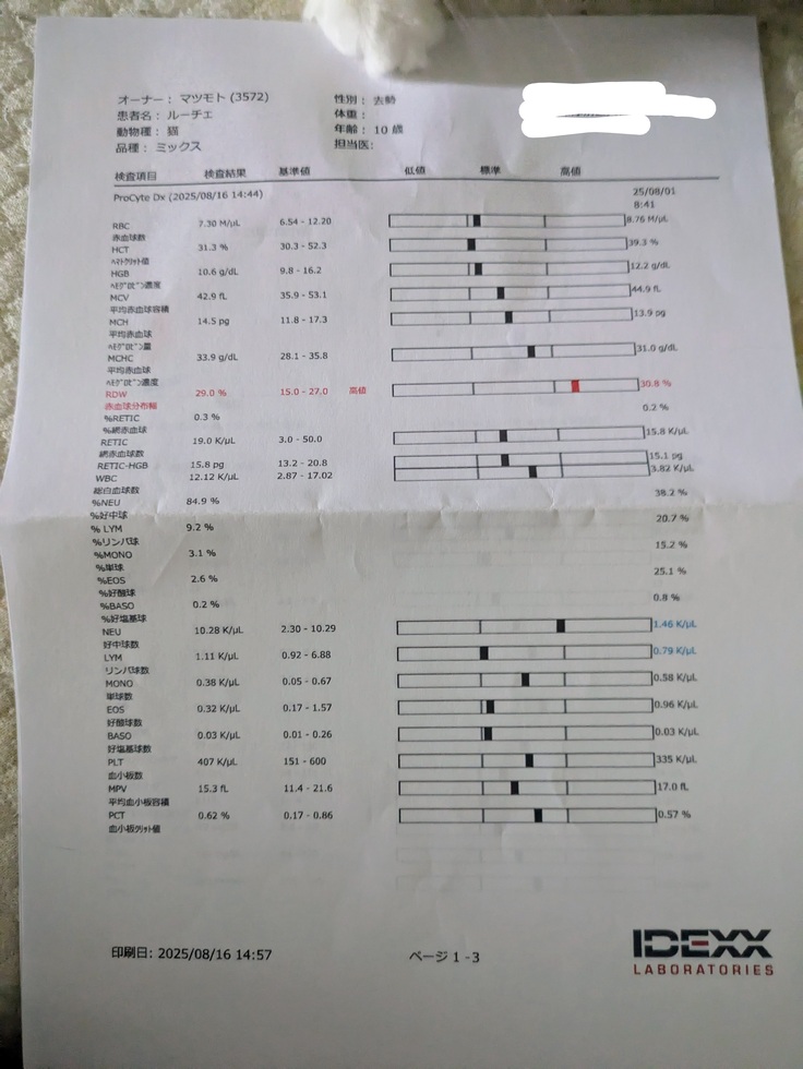 血液検査結果は赤血球が跳ね上がっていますが、(赤字部分)