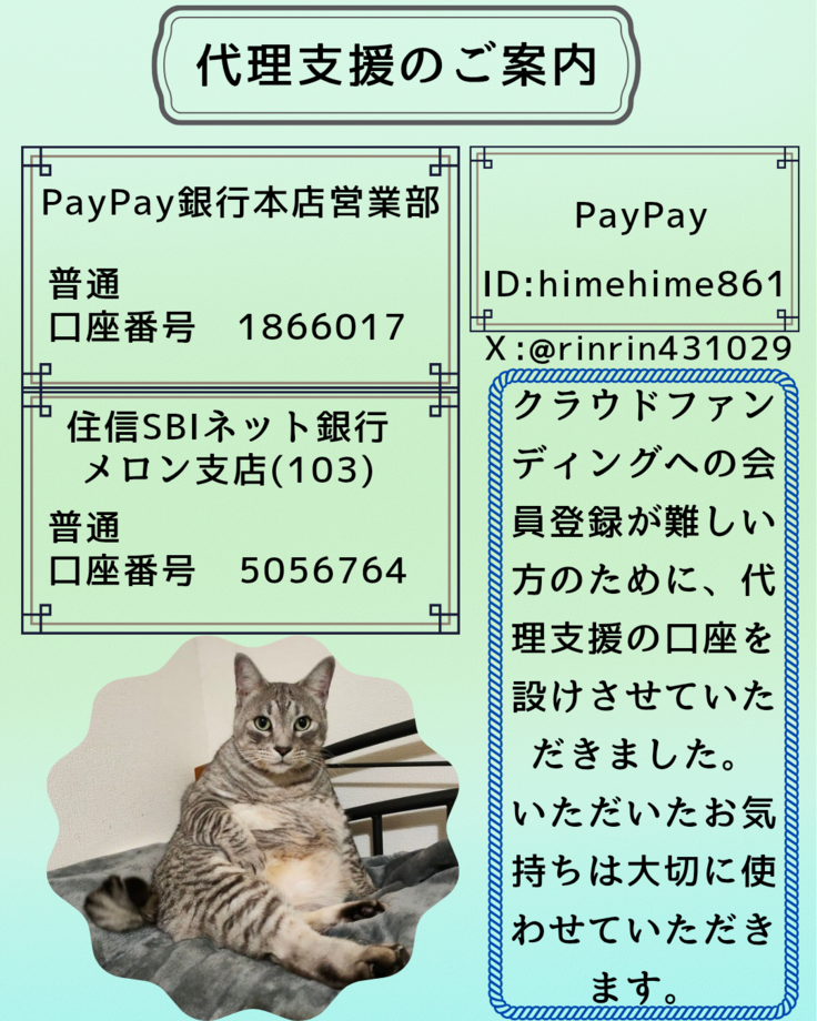 PayPay・PayPay銀行・住信SBIネット銀行のいずれかへ振り込みいただきましたら、メールでご一報ください。確認が取れましたら私が責任を持ってREADYFORへの反映をさせていただきます。