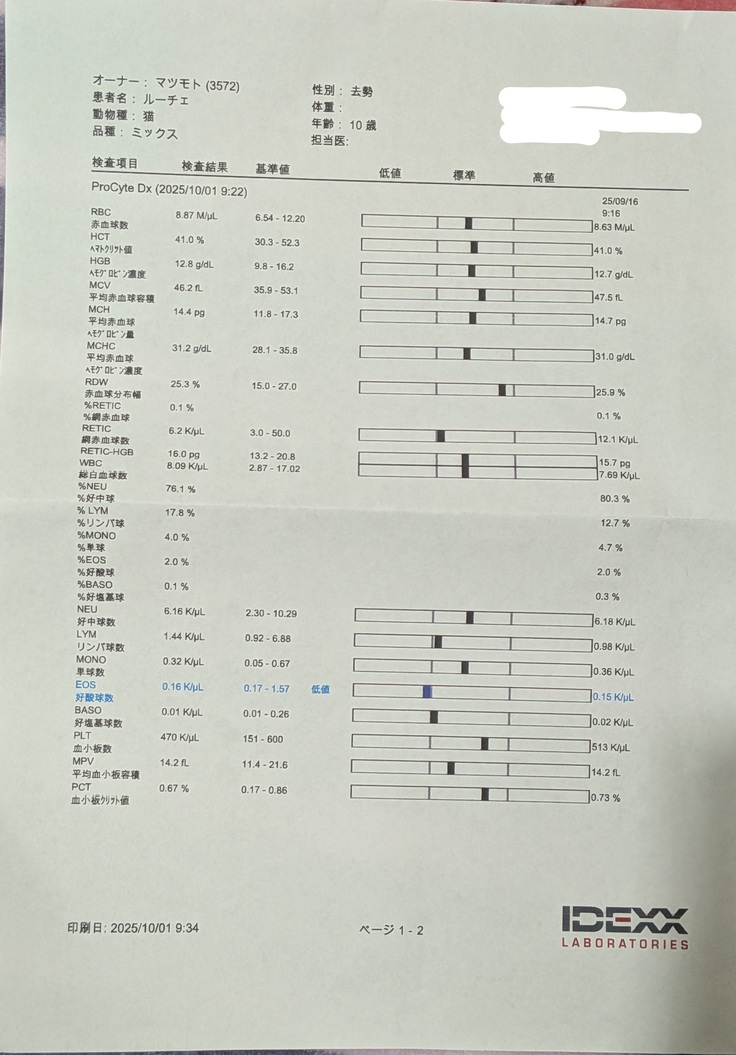 前回エコー検査はしなかったので心配なこともあり、今回腎臓、肝臓、膀胱等調べてもらったときに目の周りに侵食していた腫瘍を診てもらいましたら、目の周りは腫瘍はなくなっていました。