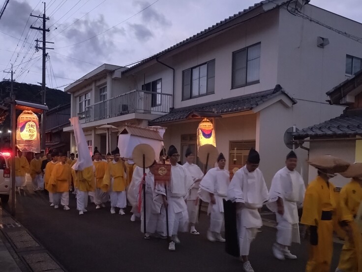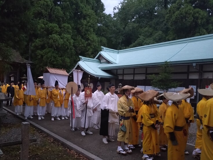 若狭姫神社から若狭彦神社への渡御においては、「遠敷大太鼓」「神楽」が参列し、仮遷座ではなかった威儀物も加わり、総勢120名を超えるにぎやかな行列となりました。