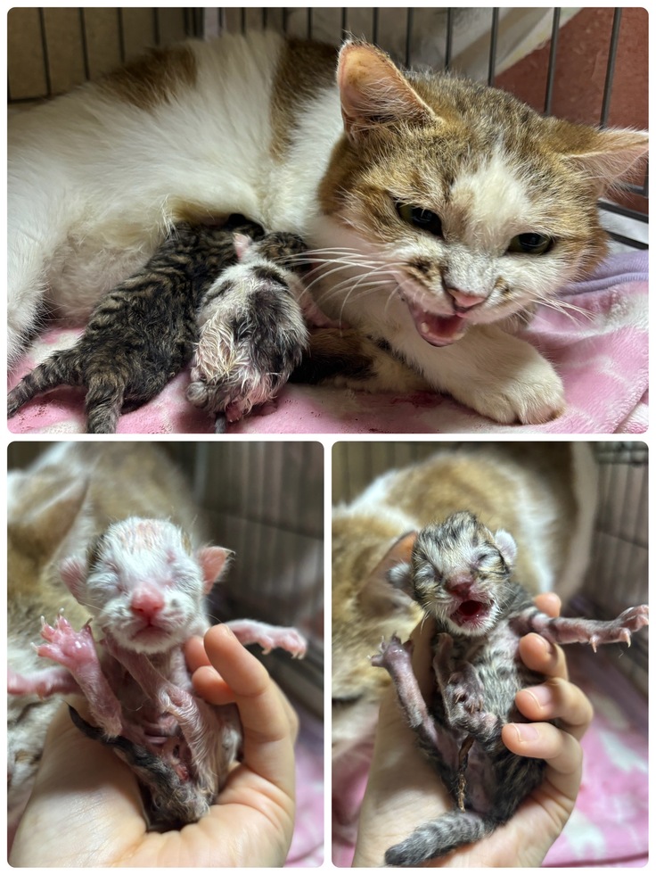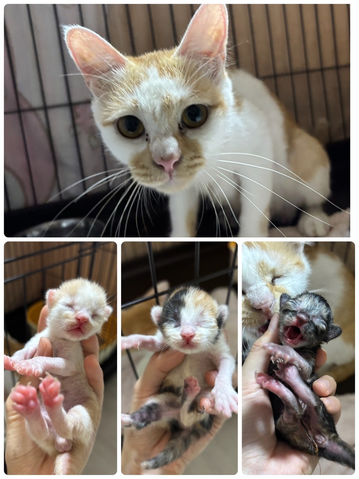 21日に保護した茶白の妊婦猫が翌22日には3頭の赤ちゃんを産みました。