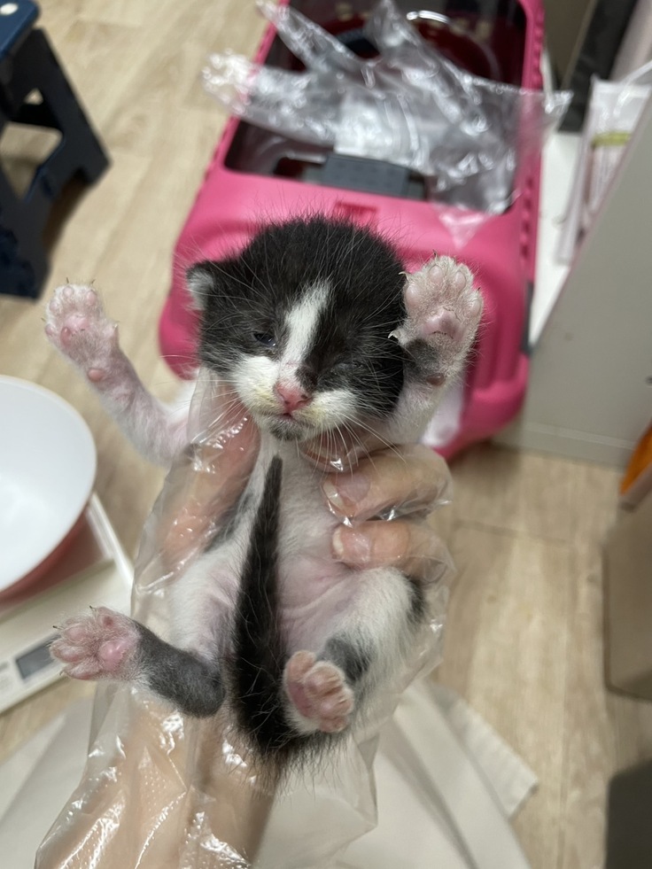 母猫が戻るかもしれないので、いったん様子見をお願いしましたが、母猫が戻る様子がなく、乳飲み子がハイハイをして道路に出そうになったので保護することになりました。
