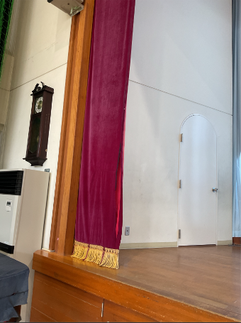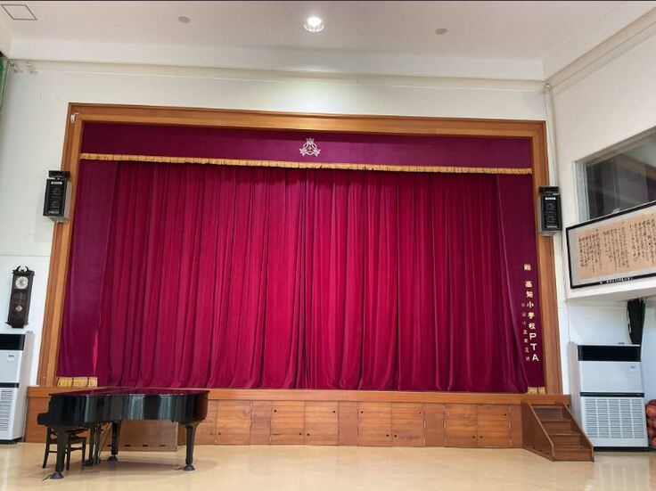 高知小学校1階、ホールステージのカーテンをリニューアルします。集まった資金は、カーテン(校章、校名等の刺繍を含む)購入費、手数料として使用します。