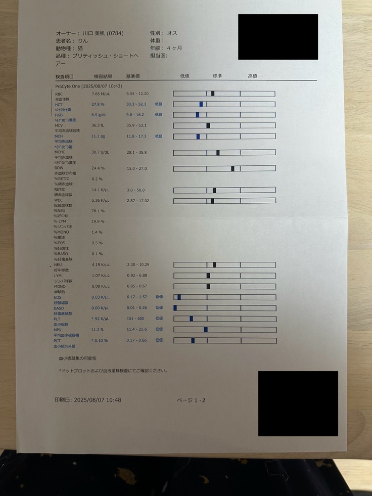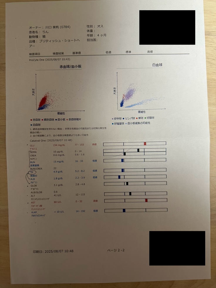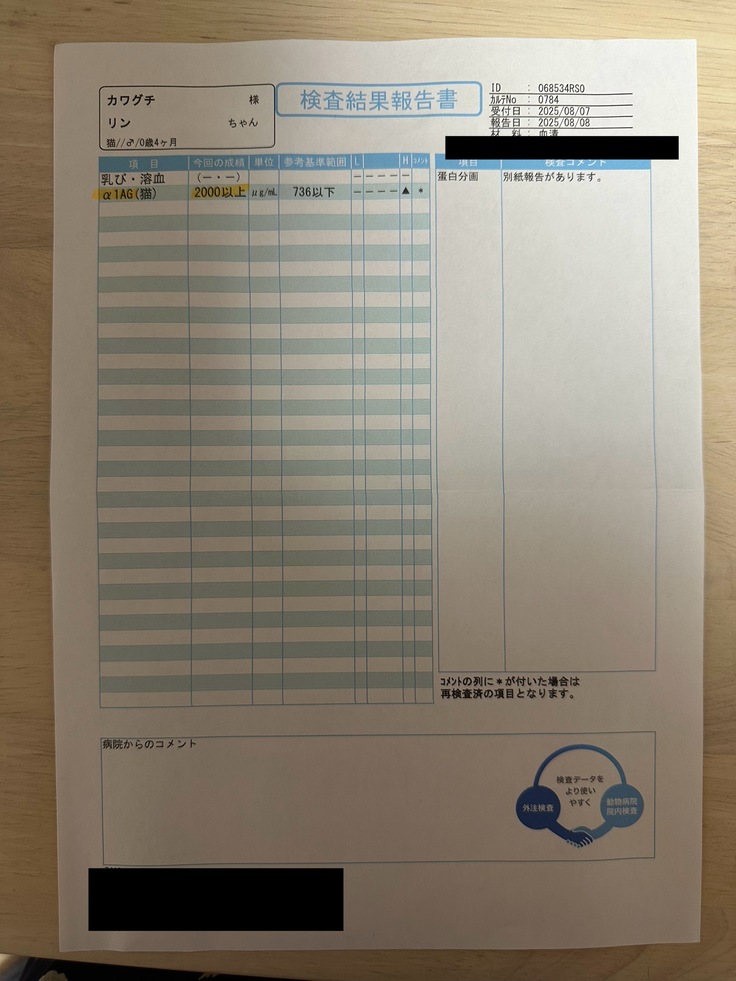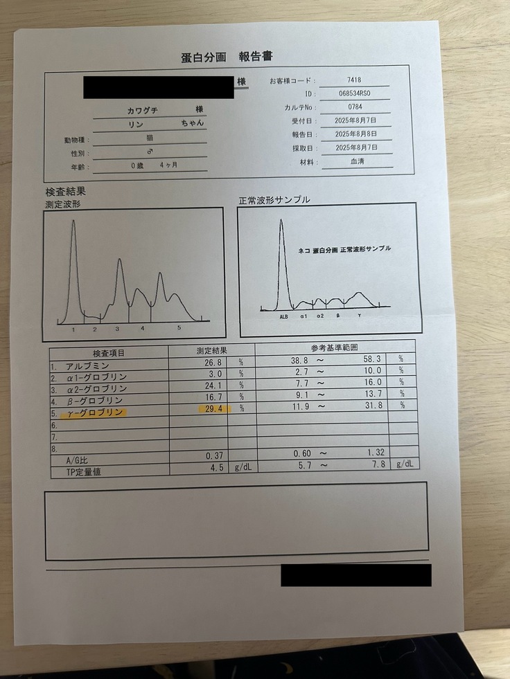 院内検査とかかりつけ病院での血液検査を照らし合わせ、たんぱく質のバランスが乱れているとのことでした。