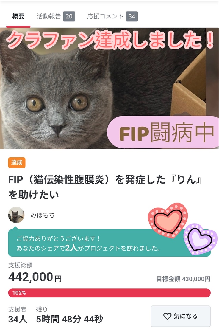 いただいた支援金は、りんのFIPの治療費用に充てさせていただきます。