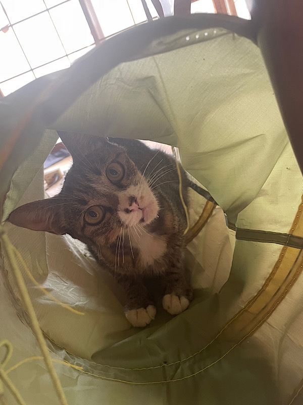 ちびちゃんのお部屋が8畳ほどしかないのでストレスが溜まらないように椅子を置いたり段ボールに穴を開けて隠れる場所を作ったりお部屋に高低差をつけたりしています!