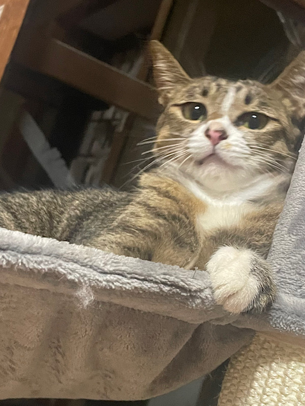 最近はキャットタワーのハンモックに寝て窓からお外を見るのが日課となりました。