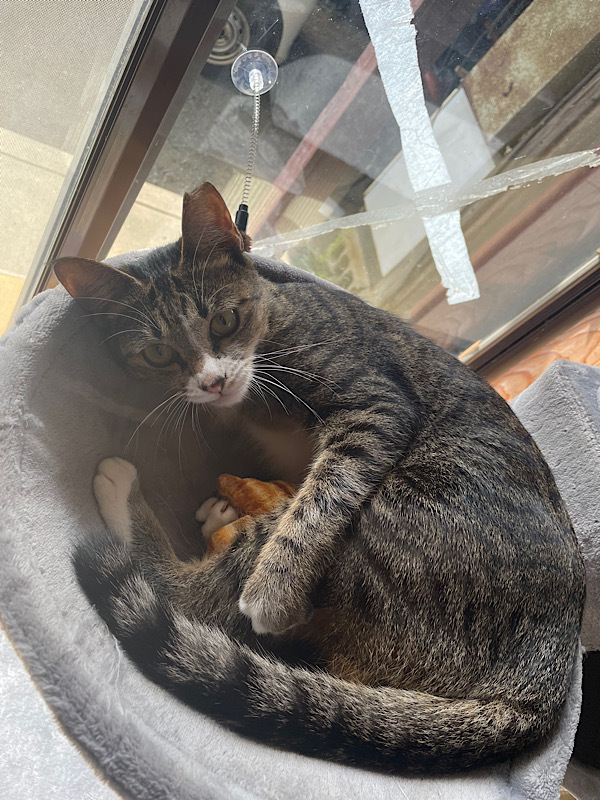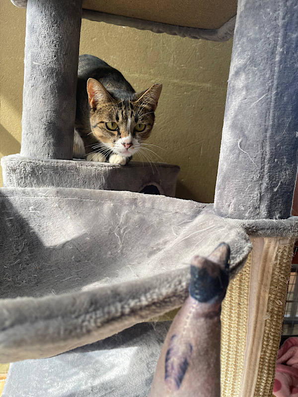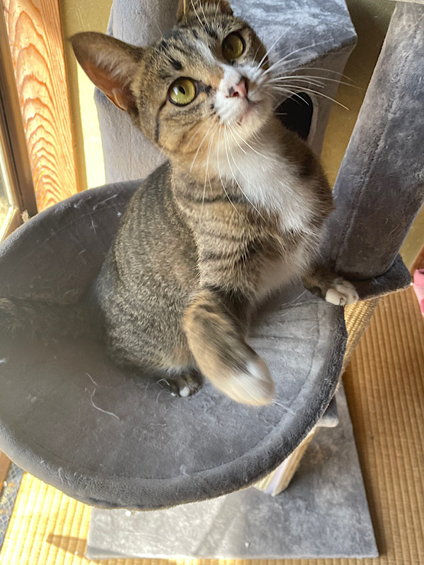 朝はお部屋の中を走り回ったり、猫じゃらしやボールで遊んだりお昼は大好きなキャットタワー🐈の上で気持ちよさそうに日向ぼっこしたりお外を観察しております!