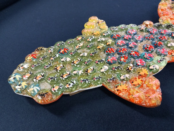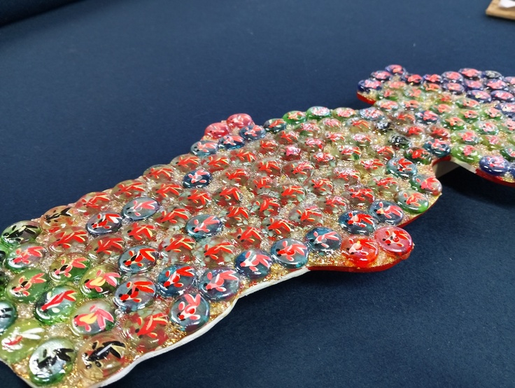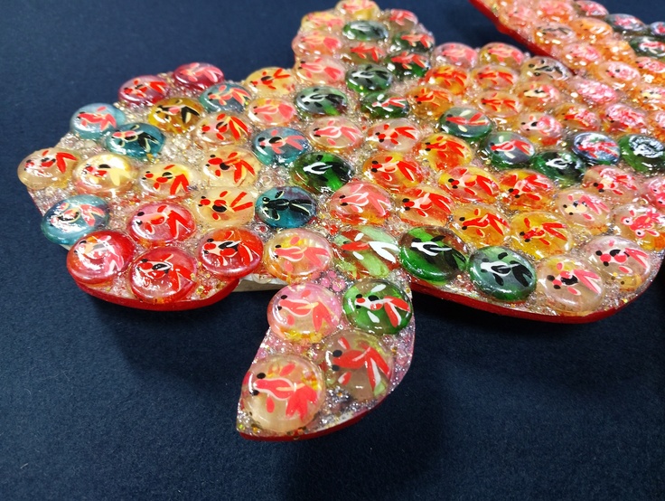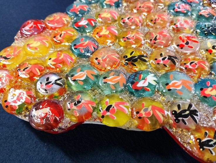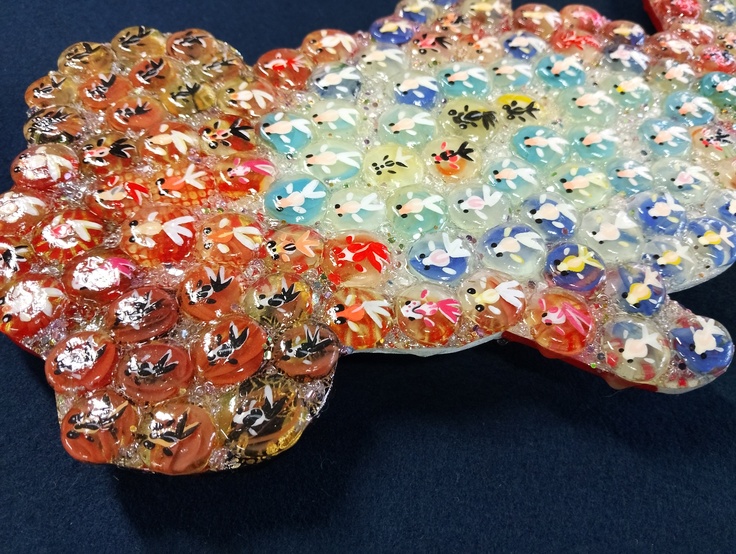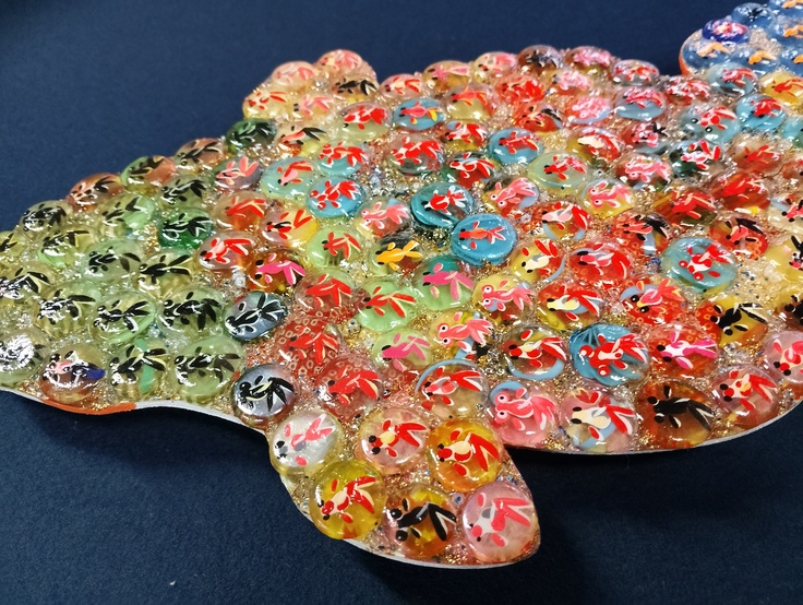 1枚1枚オハジキに金魚を描いて組み合わせて制作しています。