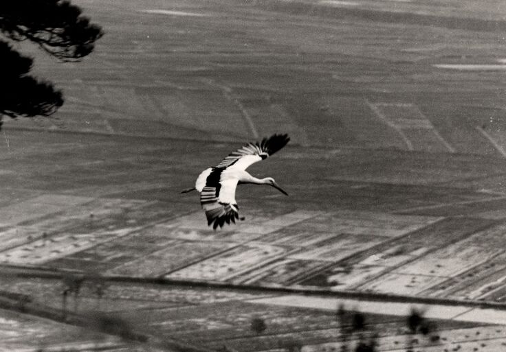 小浜市国富地区を飛翔するコウノトリ(昭和30年代)