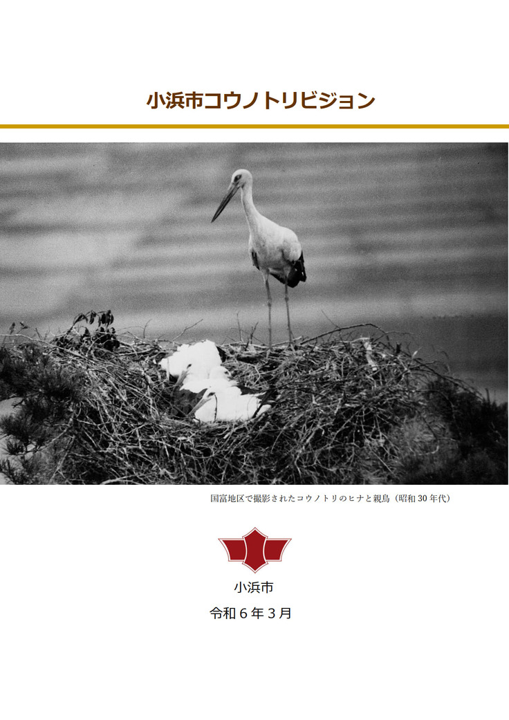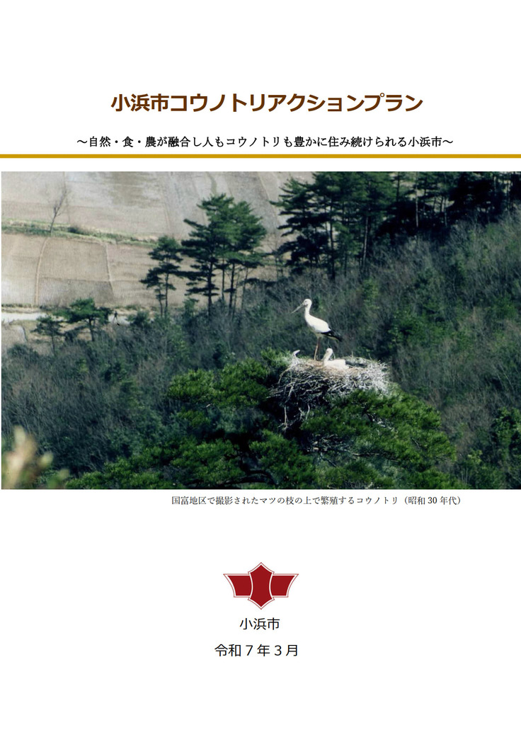 本市のコウノトリとの古くからの縁と地域の自然環境を結び付け、守り、次世代につなぐことは、本市の特色である豊かな「食」を育む礎となります。 そこで本市では、令和6年3月に、「自然・食・農が融合し人もコウノトリも豊かに住み続けられる小浜市」を目標に掲げる、コウノトリをシンボルとして「コウノトリビジョン」を策定しました。また、令和7年3月には、同ビジョンを具体化した「コウノトリアクションプラン」を策定し取組を推進しています。