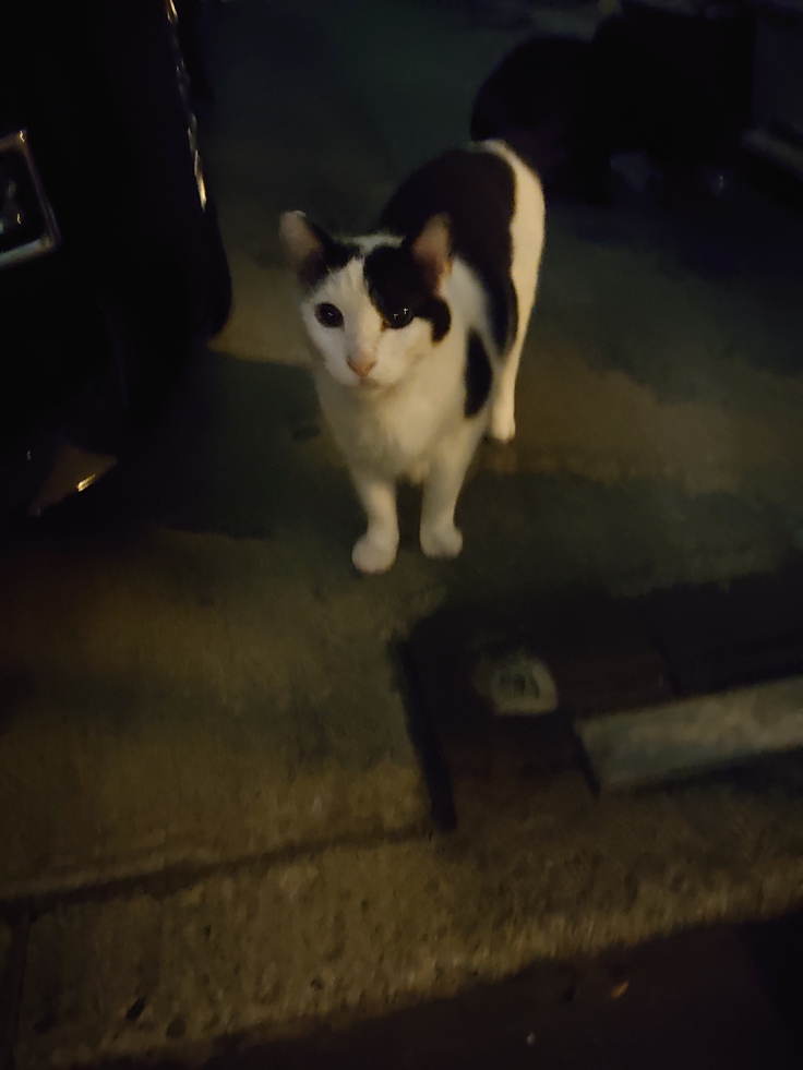 身体は大きいのですが、いつも来る黒猫ちゃんが気が強くて、一歩引いてご飯が出てくるのを待ってます💦