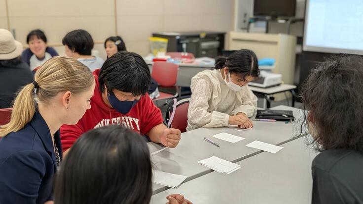 その後、スターグローブの学生チームは、身近な外国出身の留学生にインタビューを行ったり、塾内で対話の時間を設けてテーマを話し合ったりしながら、日本の学校に通う外国出身の子どもたちが感じている課題を共有してくれました。学生たちのまっすぐなまなざしが、カード制作に新しい視点をもたらしてくれています。