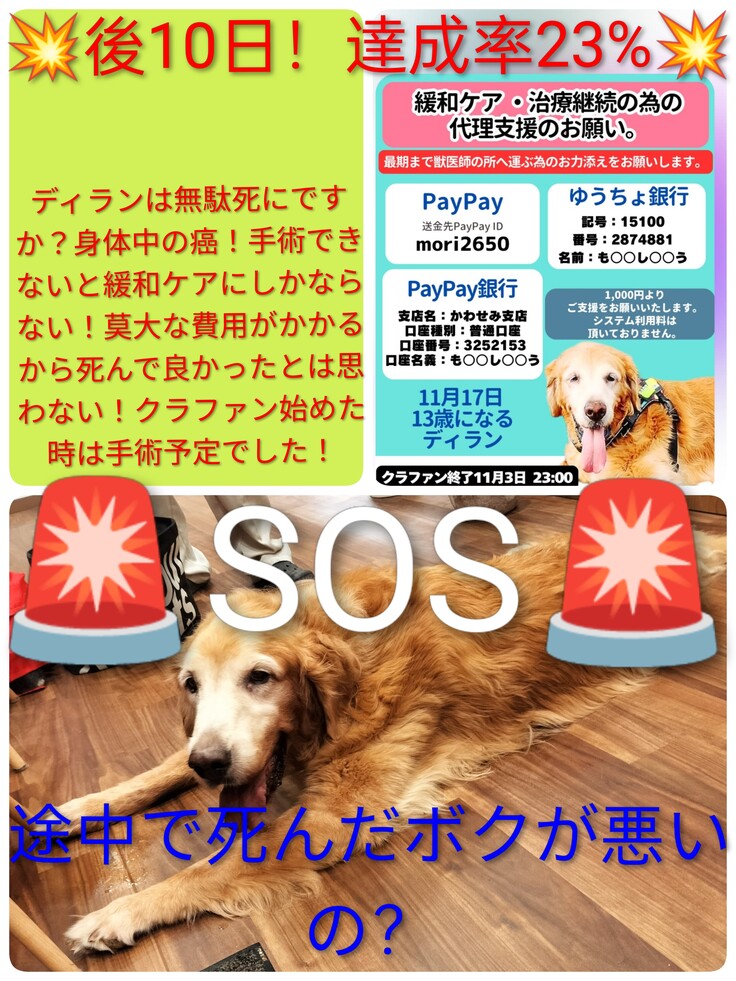 🚨SOS🚨助けてください🙏🙇後10日...達成率23%😭最期の入院治療費や葬儀代が払えません。パパは悪性リンパ腫移行病です!長年の粉塵を吸い、肺が溶けています。重度の肺気腫です。ディランが死んでしまい自分をせめて消沈し、食事が出来ていません。ママはディラン入院時、死んだ後、救急車🚑️で運ばれてます。酷い喘息発作。去年心筋梗塞をして1年半ぶりにニトロが離せません。ディランと一緒だったチワワは大粒の涙をこぼしディランの遺骨から離れません、猫も体調不良です。
