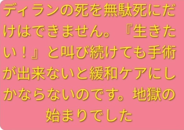 今日が山と言われて ふた月が経過しました。その間の通院 検査、介護用品、療養食等に出費が多く、感謝のメール(写真付き)しかご用意が出来ず、申し訳ありません。ご支援はDylanの為に大切に使わせて頂きます。