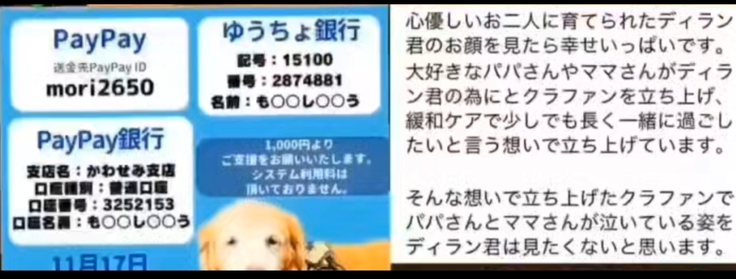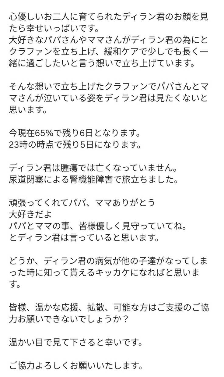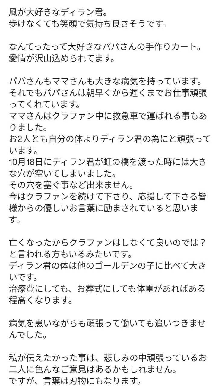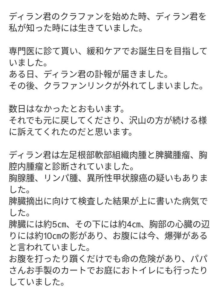 今日が山と言われて ふた月が経過しました。その間の通院 検査、介護用品、療養食等に出費が多く、感謝のメール(写真付き)しかご用意が出来ず、申し訳ありません。ご支援はDylanの為に大切に使わせて頂きます。