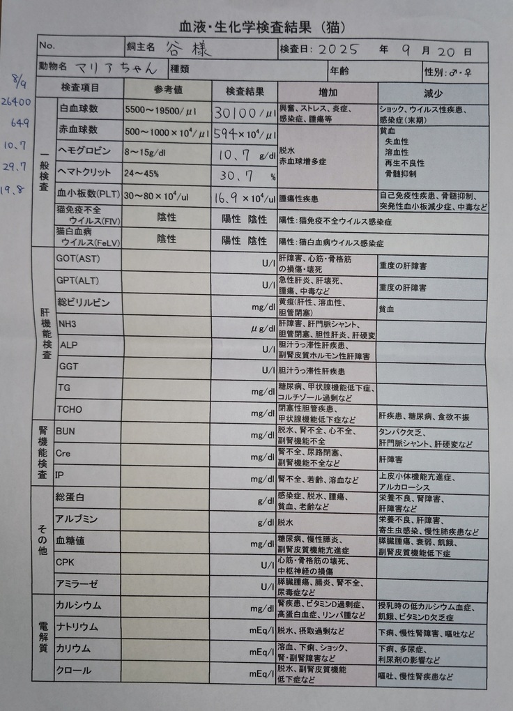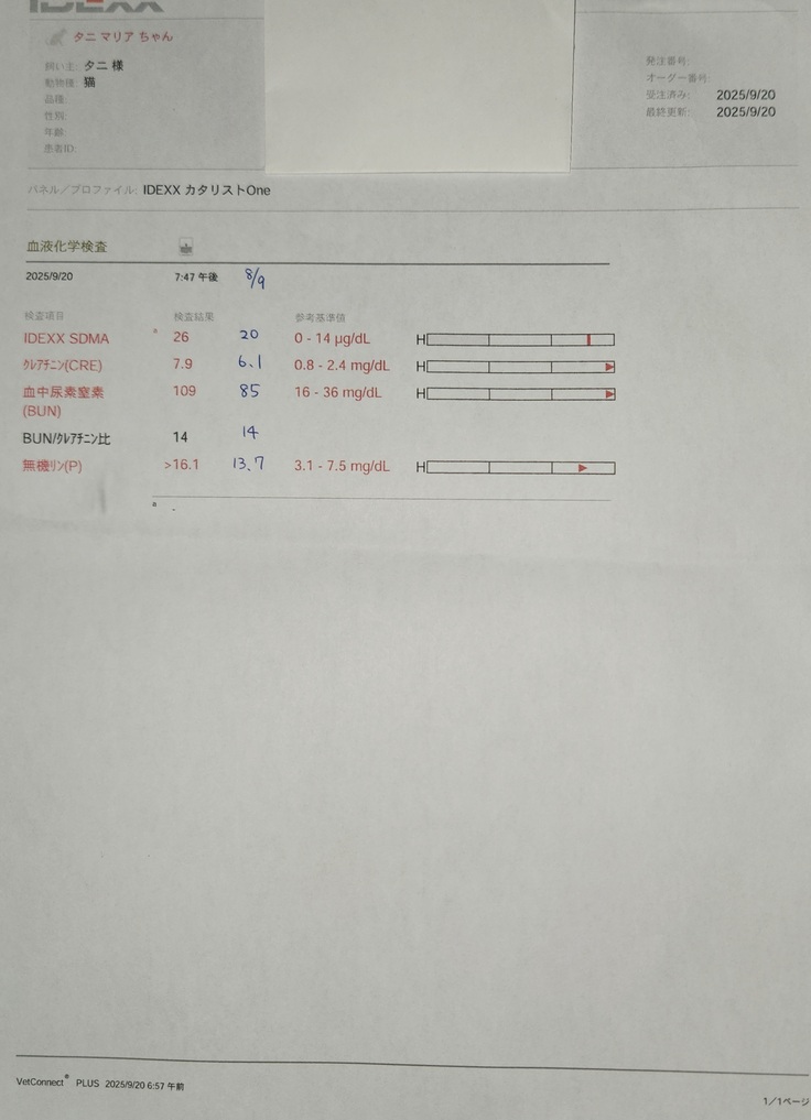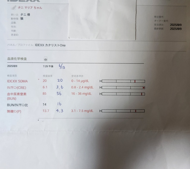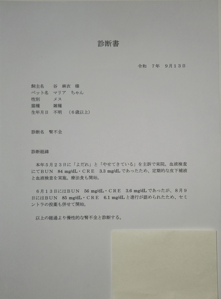 8月9日には血液検査の数値も前回より悪くなっており、同じ腎不全で通院中のジュニアが飲んでいるセミントラというお薬をその日からマリアも飲み始めることになりました。