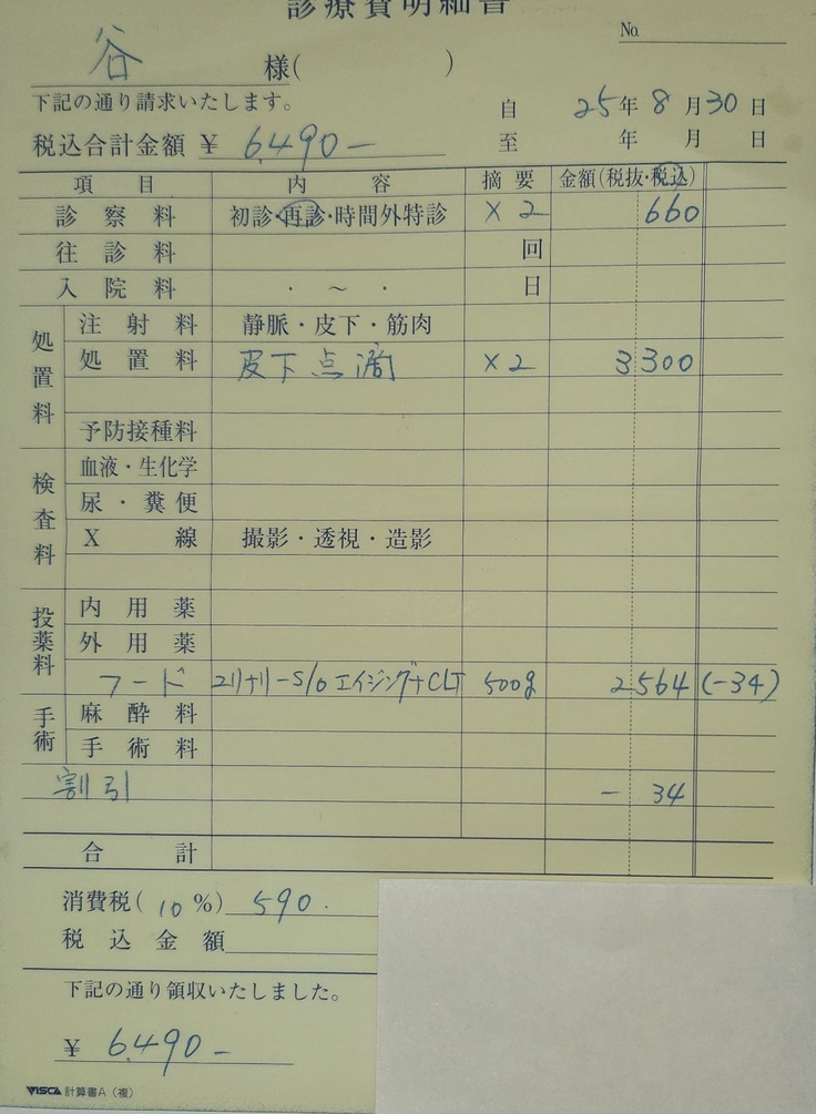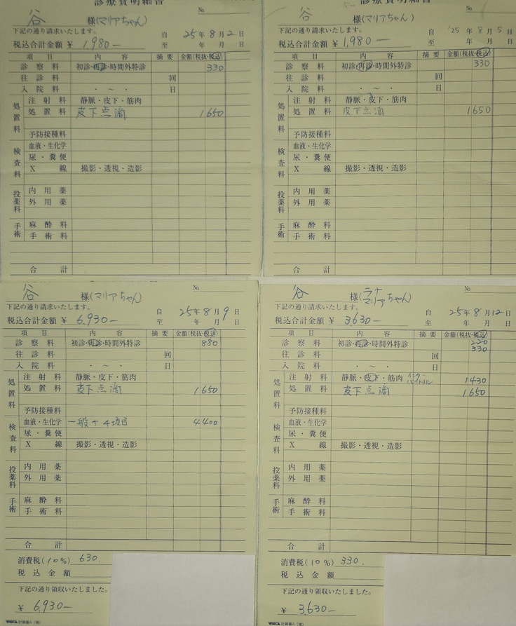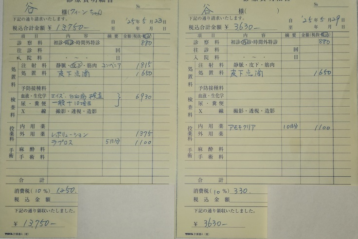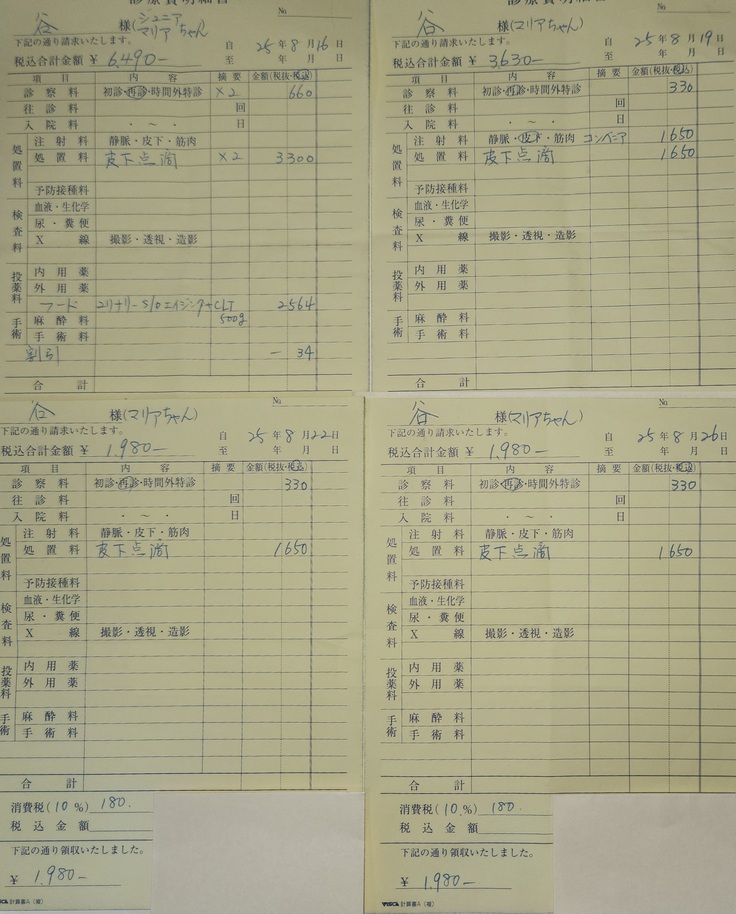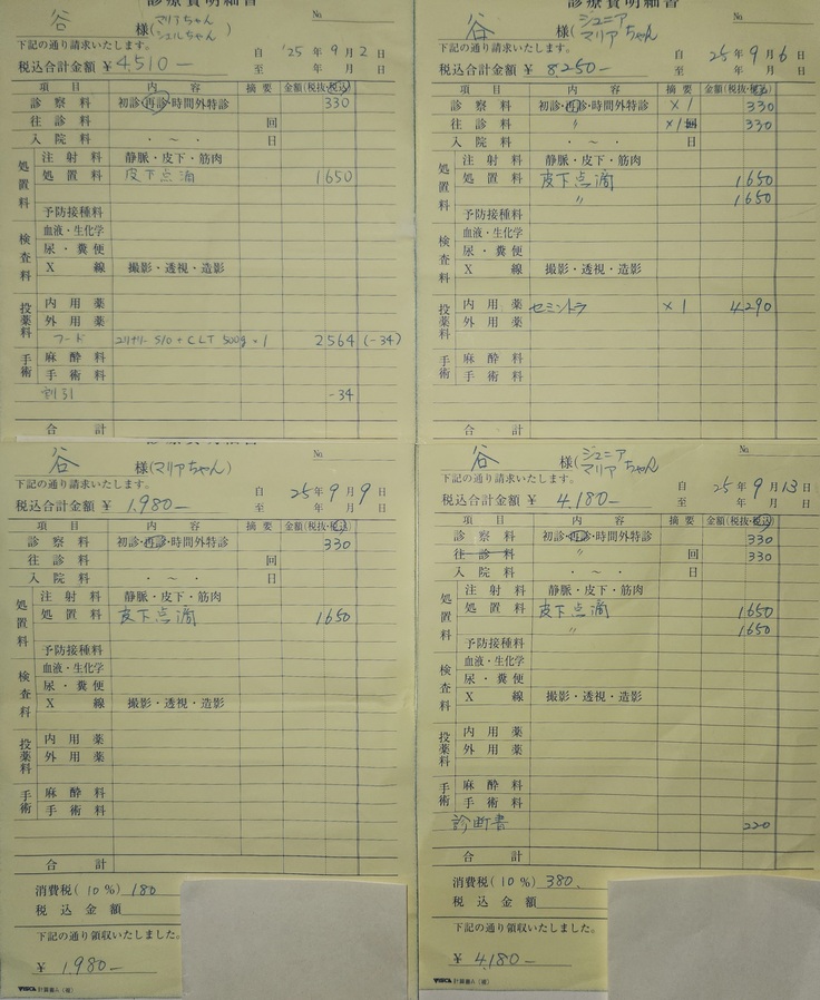 ジュニアと同じ日に病院へ行く日もあるため2匹一緒の領収書になっている日があります。)