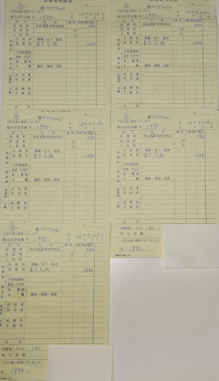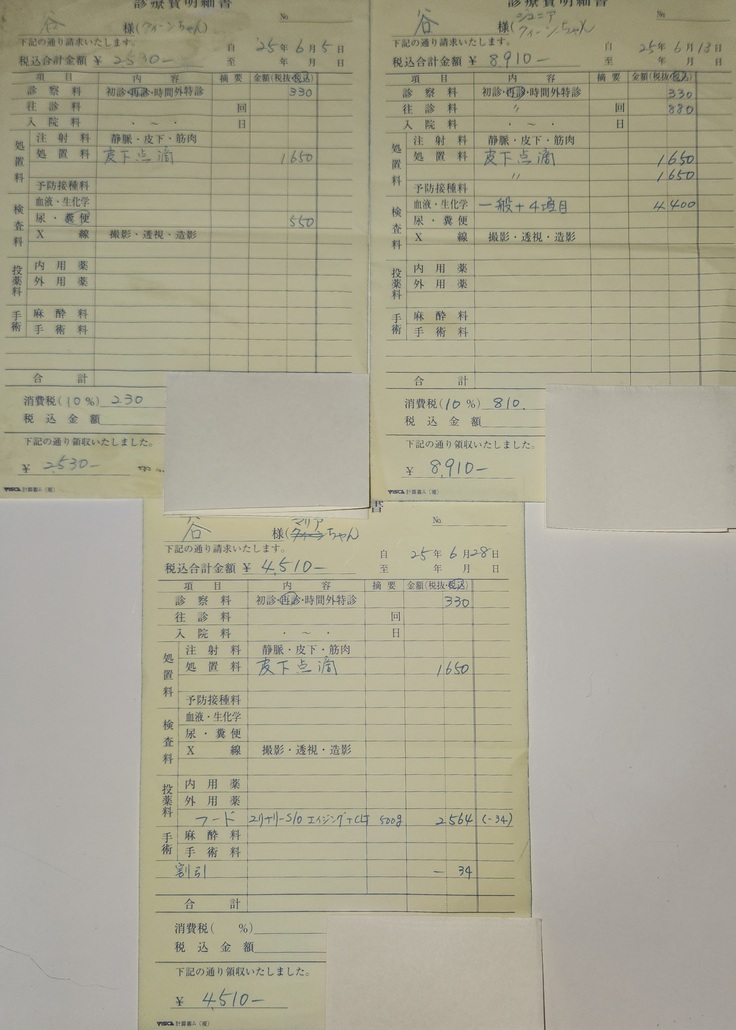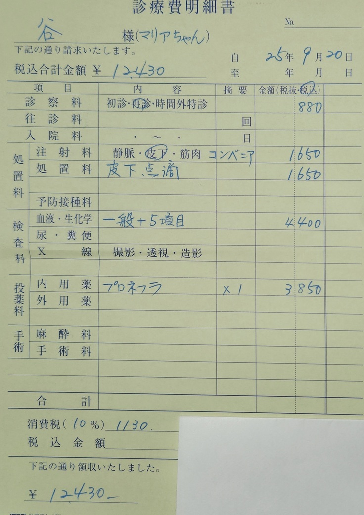 (今までの領収書です。保護をした直後名前が決まるまでの間だけ仮名クイーンちゃんになっております。
