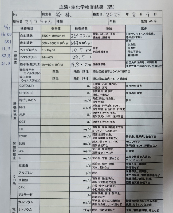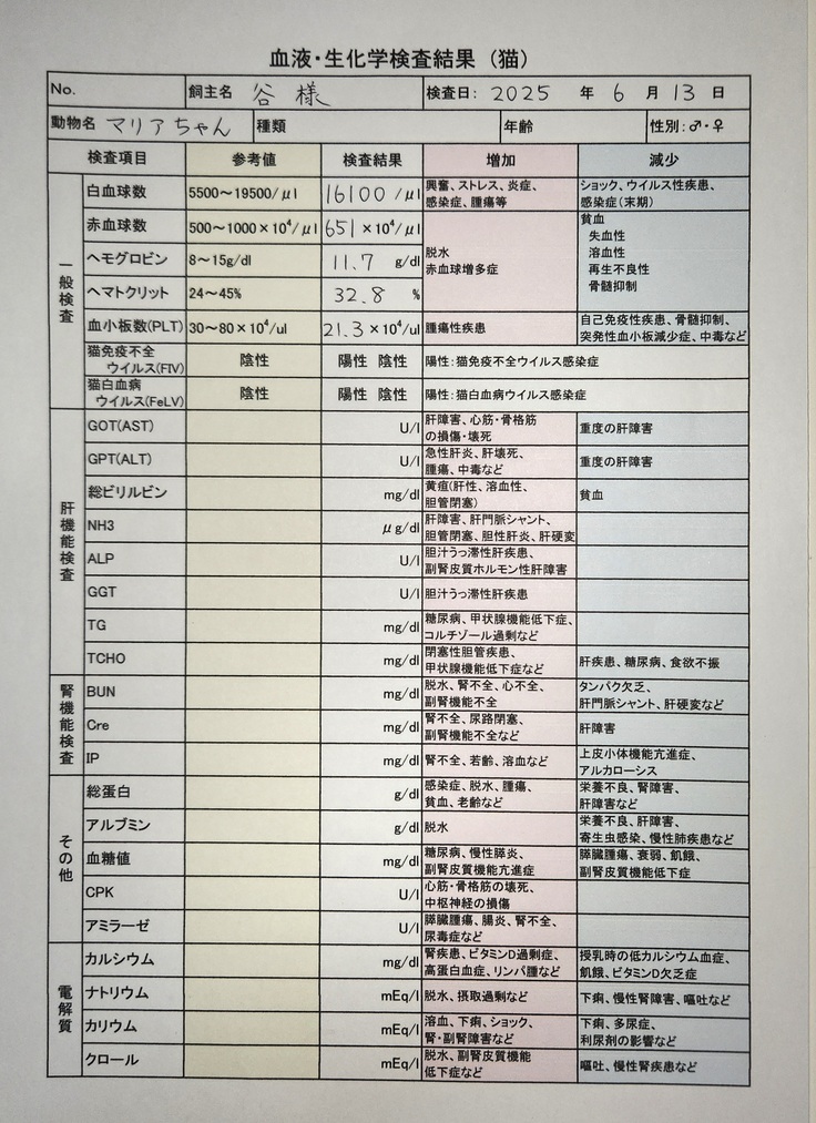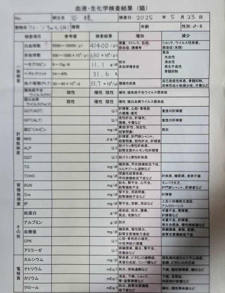 3回目の血液検査。白血球が6月13日の時よりまた少し高くなっており、先生曰く歯の炎症のせいかなとの事でした。