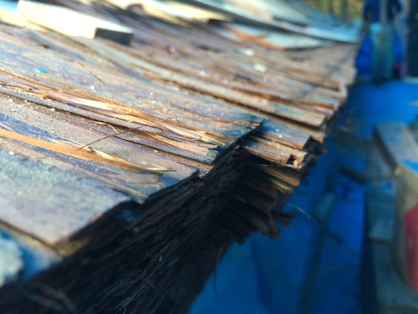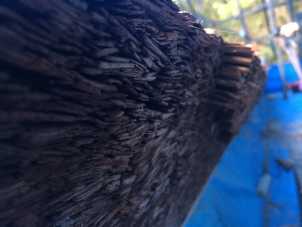 定規を当ててできる作業ではないので、職人の感覚で切りそろえられていきます。しかも、ただまっすぐに切れば良いという訳でなく、下から見上げた時に美しく見える為には、微妙に曲線を描いたような仕上げが必要とのこと。
