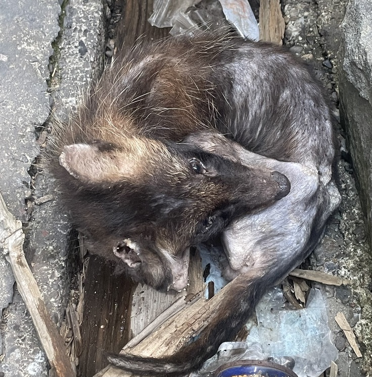 そのタヌキは駐輪場付近に1ヶ月ほど前に現れ、全身ハゲていて疥癬でした。