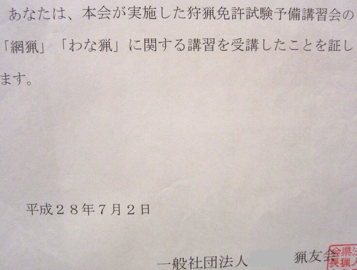 卒業校や前職の経験で上記写真「罠の講習」を受講しております。