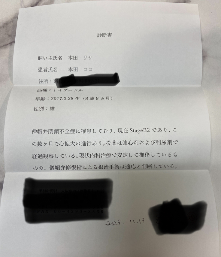 ココの僧帽弁閉鎖不全症の今後の手術費用にあてます。