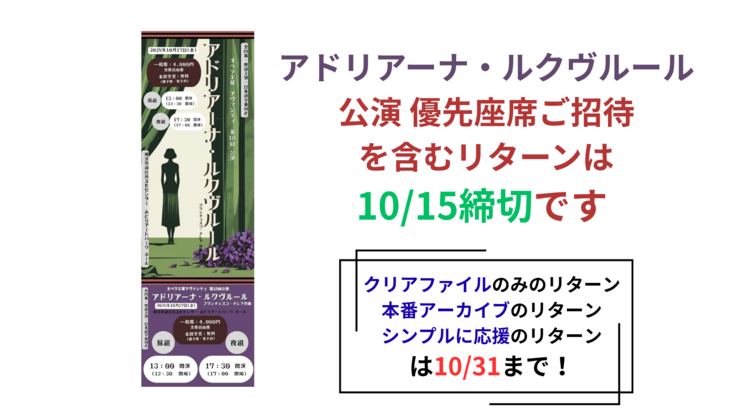 公演《優先座席》ご招待、を含むこちら(下記)のコースは、本日【10/15】中で、締切となります。ご了承下さいませ。