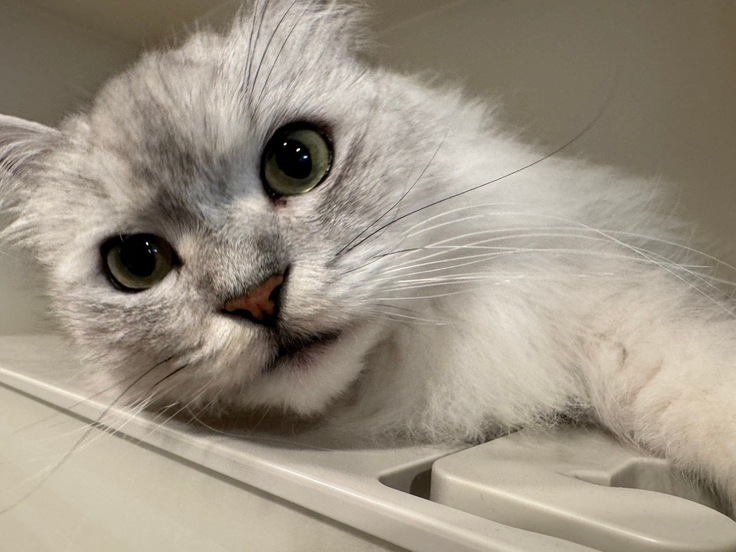 リエルは病気になる前は家の中を走り回ったりジャンプしたりニャルソックもしたりと、とても活動的な猫でした。気管が狭くなってからはやはり呼吸が苦しいのか座っていたり横なって寝ていることが増えました。たまに、少しだけゆっくり駆け足でこちらに向かってくることはありますが、以前のような俊敏な動きはできなくなっています。リエルは呼吸以外はとても健康で元気なので、手術をして呼吸しやすくなって、いつものように駆け回る姿を見たい、生後2ヶ月から大事に育てている猫なのでもっと一緒にいたい、過ごしたい、そばにいたいという気持ちが強いです。