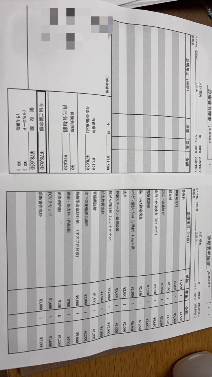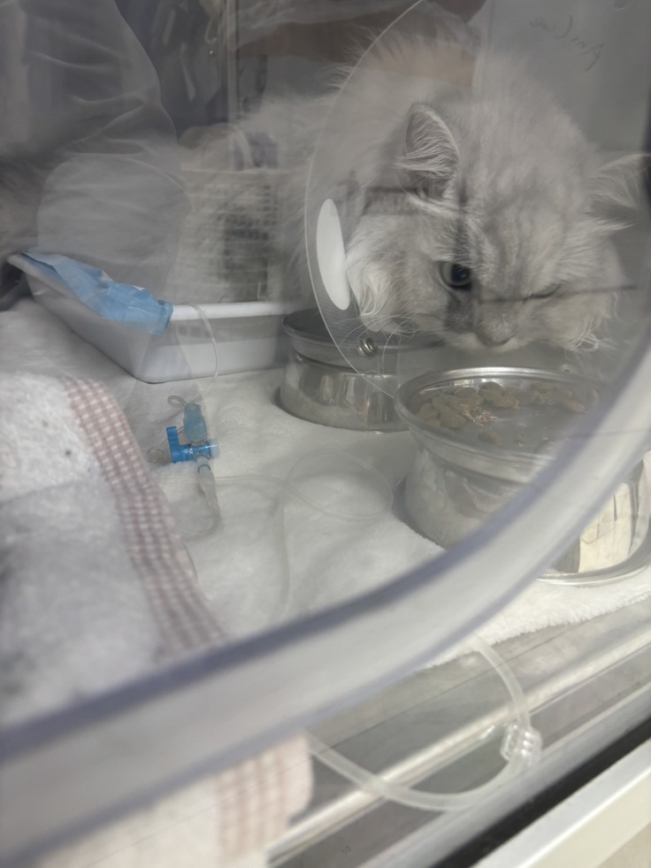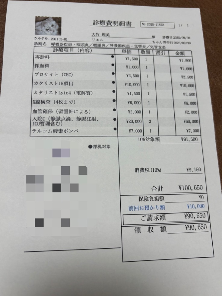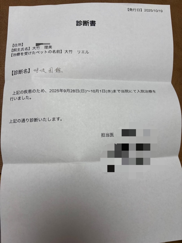 2025年9月28日にリエルがなんとなくだるそうで口呼吸をしてたので急いでA病院に連れて行くと酸素飽和濃度が92%ということで即、酸素室に入院になりました。酸素室から出ると酸素飽和度が下がるので緊急度が高いと言われました。