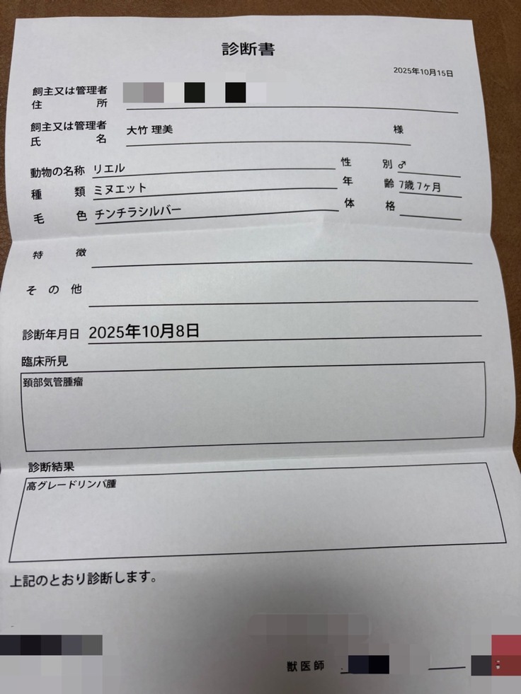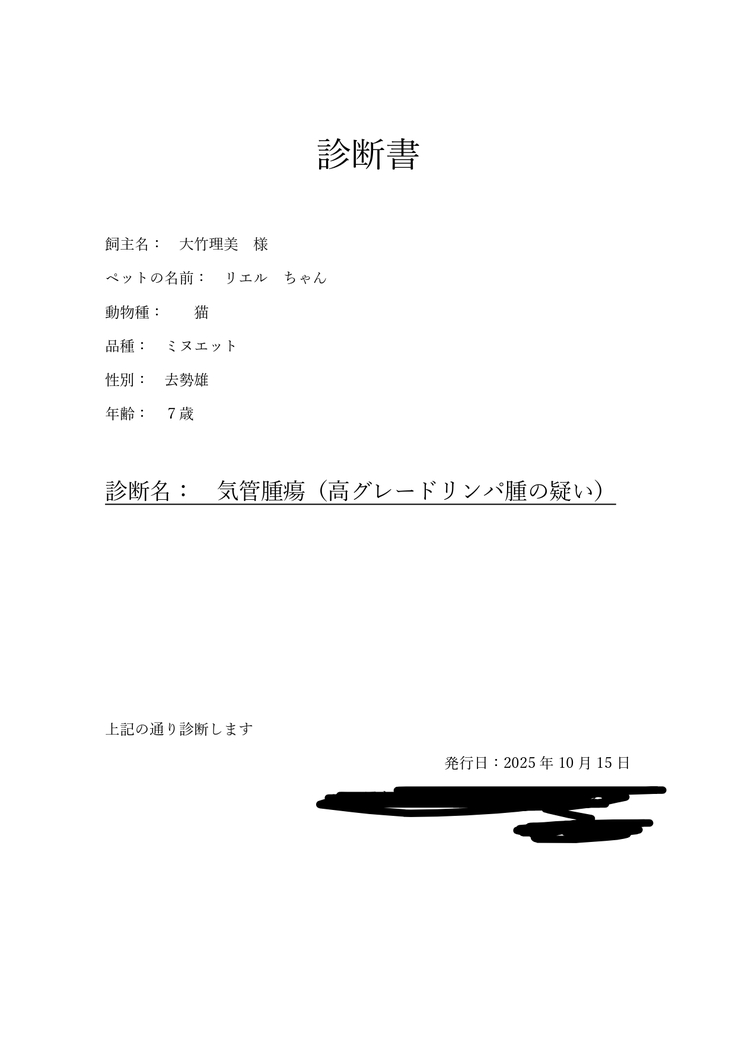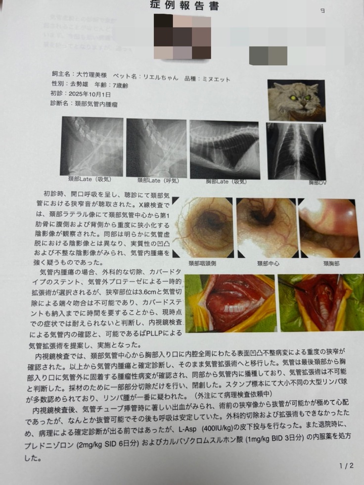 2025年9月 鼻詰まりがひどく、病院に行っても治らない。どうして?と思い自分で気管虚脱の手術がしてもらえる病院を探しました。専門の病院が家から遠いので診察してもらえるまでに10月になりそうでした。
