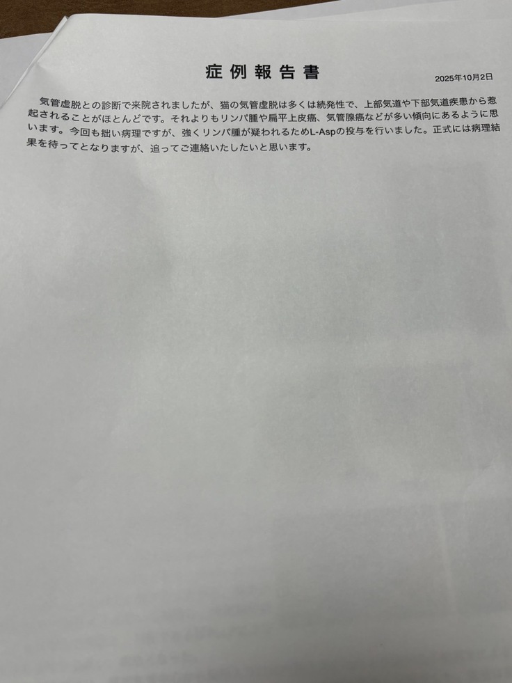 10月1日に呼吸器専門のC病院でレントゲンを撮ると専門の先生に、レントゲンの気管の狭さを診ながら、これは気管虚脱ではないかもしれない。気管内腫瘍かもしれないと言われました。