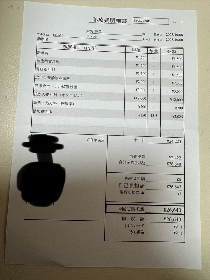 10月4日に腫瘍専門の先生のいるC病院で診察してもらい、抗がん剤治療を続けて行くことになりました。10月8日にオンコビン、10月17日にエンドキサンという薬を静脈注射で打ってもらいました。リエルは現状、副作用もほとんどなく過ごしております。