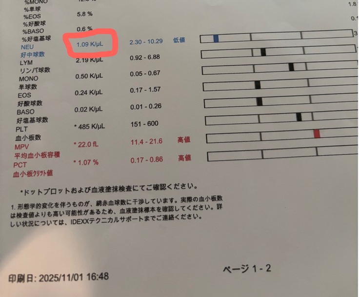ドキソルビシンを投与する予定でしたが、オンコビンの影響か副作用で白血球が著しく減っていたので今週は投与をお休みすることになりました。