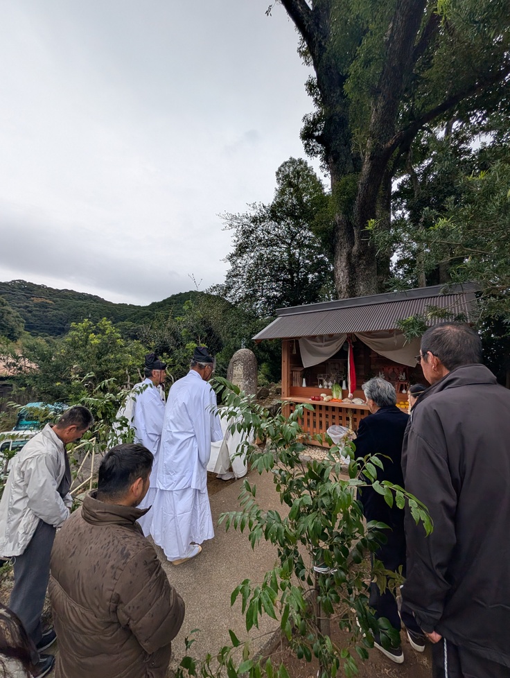大馬神社の山東宮司から、伐採と社再建の労いを祝詞に入れてくれました。とても嬉しく、仕事冥利に尽きるなと感動しました。そのあと、徐福の宮から見上げる位置にある波田須神社の神事も見学しました。