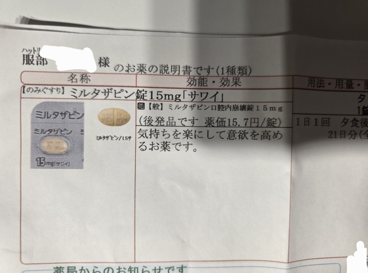 私は今現在抗うつ薬、ミルタザピンという薬を飲んでいます。