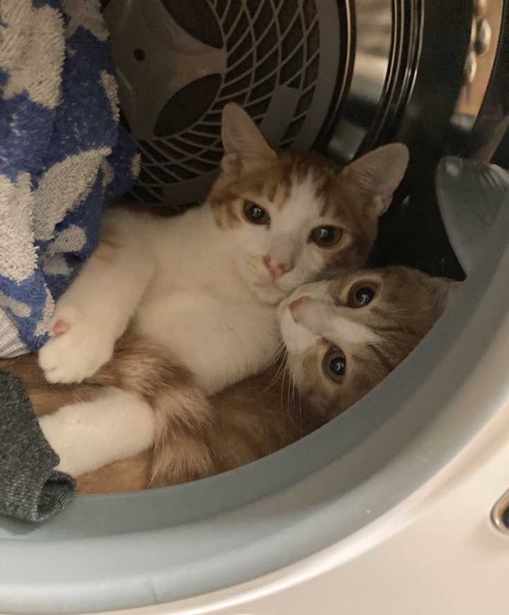 終わった乾燥機の中に飛び込む2匹。ほかほか。