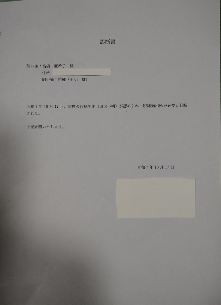 診断書のペット名はこの時はまだつけてなかったので名前は無しになっています。