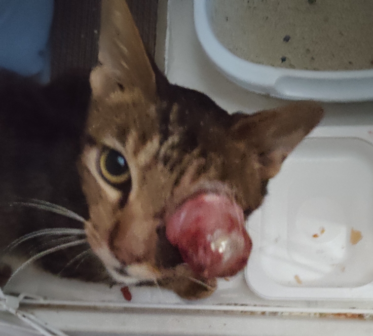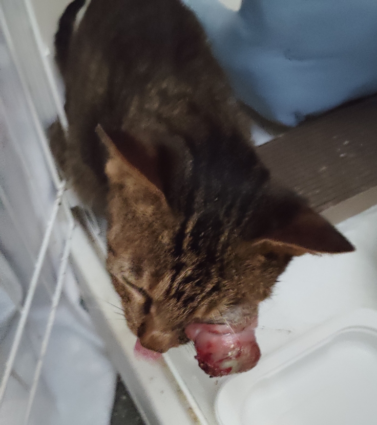 自宅で保護してましたがこの状態でもご飯を一生懸命に食べて生きようとする子をなんとかしてあげたいと思い外科手術のできる病院へ連れて行きました。