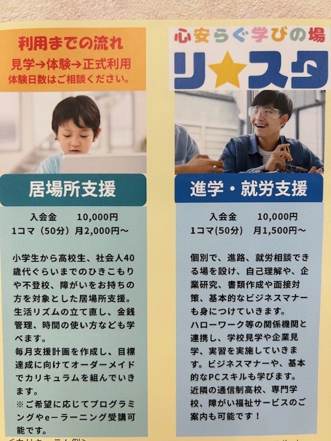 弊法人が運営する「心安らぐ学びの場リ★スタ」は、小学生から社会人40歳代ぐらいまでの方のひきこもり、不登校、障がいをお持ちの方の居場所、進学・就労支援を行い、誰もが安心して過ごせる場所、気軽に訪れられる場を提供しています。15時以降は、小学生の方を対象としたアフター教室を展開しております。