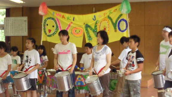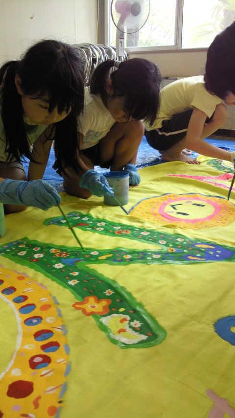パーカッションだけじゃなく、アートの共同製作ワークショップも同時にやっちゃうのがOVO NOVO。今回は、幅3メートルの横断幕を作りました。