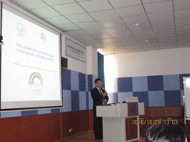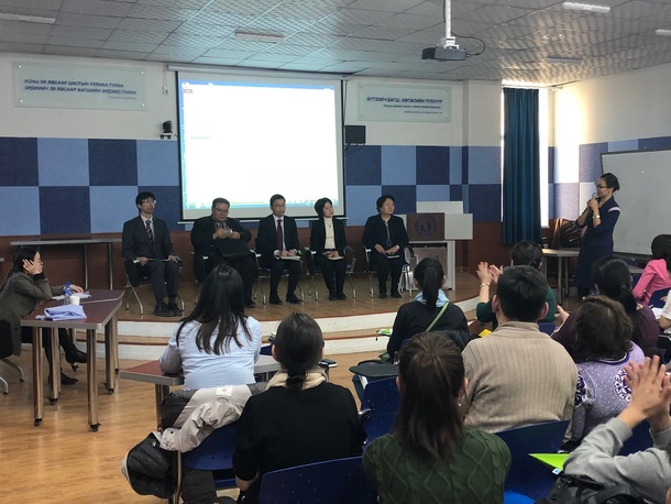 10月9日、「名古屋大学モンゴル国立教育大学子ども発達共同支援センター」主催の研修会、「特別ニーズのある子どもへの支援とその方法」が開催され、モンゴル国立教育大学教員やモンゴル国内の小中学校の教員、およそ100名が参加しました。名古屋大学のスタッフからは「社会性の発達の支援―共同注意と遊び」「落ち着きのない子どもの心理学的特徴」、「学校における『問題行動』への対応」についてお話をさせていただきました。