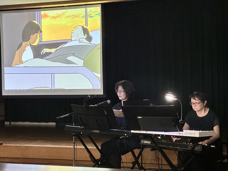 さて、9月13日(日)夜間開園中の広島市植物公園では、安芸区で紙芝居活動をしている団体「安心・安全を伝えるグループほっとつながる未来へ」による絵おと芝居『ヒロシマ緑の輪物語』の公演がありました✨演奏は、森恭子さん、山下京子さん。