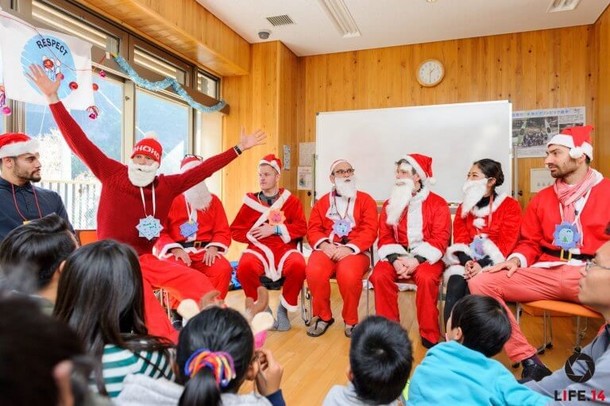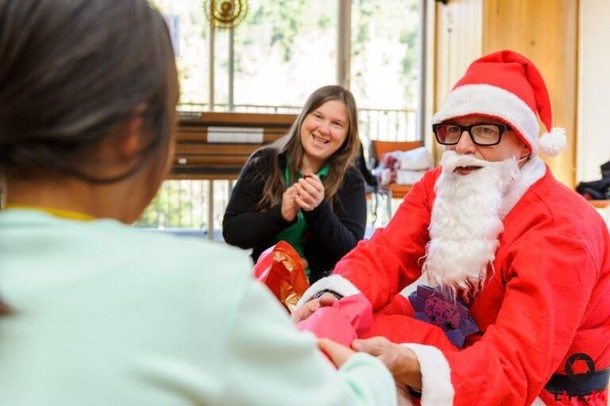 英語を使ったゲームをしてお互いのことを知った後、チームに分かれてデコレーション、クッキー作り、小枝を使ったクリスマスカード作りを行いました。準備が整ったところで、新宿から自転車でやってきたサンタさんたちをお出迎えし、一緒に美味しいシチューを食べました。子どもたちが楽しみにしていたプレゼントタイムでは、サンタさんたちから素敵なプレゼントをもらいました。サンタさんたちをお見送りした後は、本当のクリスマススピリットである、もらうだけでなく「何かをあげること」について学び、子どもたちは今日来れなかった友達のためにカードをつくりました。