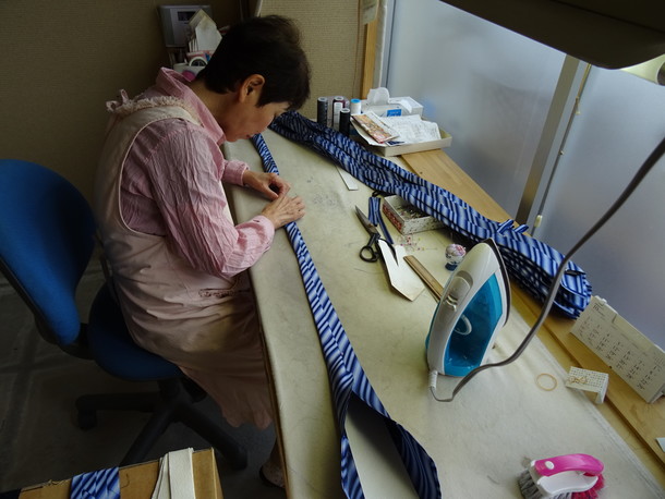 合成繊維で作る安価な外国産のものが出回り、ますます状況は厳しくなりました。今では最盛期の10%しか、国産ネクタイを作る業者は残っていないといいます。 縫製も絹地も世界レベルなのに、このまま衰退していってしまうのは、とても、もったいないことだと思いました。