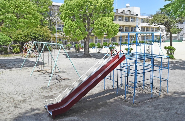 島原市立第一小学校の子どもたちが、毎日楽しんで遊んでいる庭園の遊具は、ブランコや滑り台、ジャングルジムなど、子どもたちに人気の遊具です。