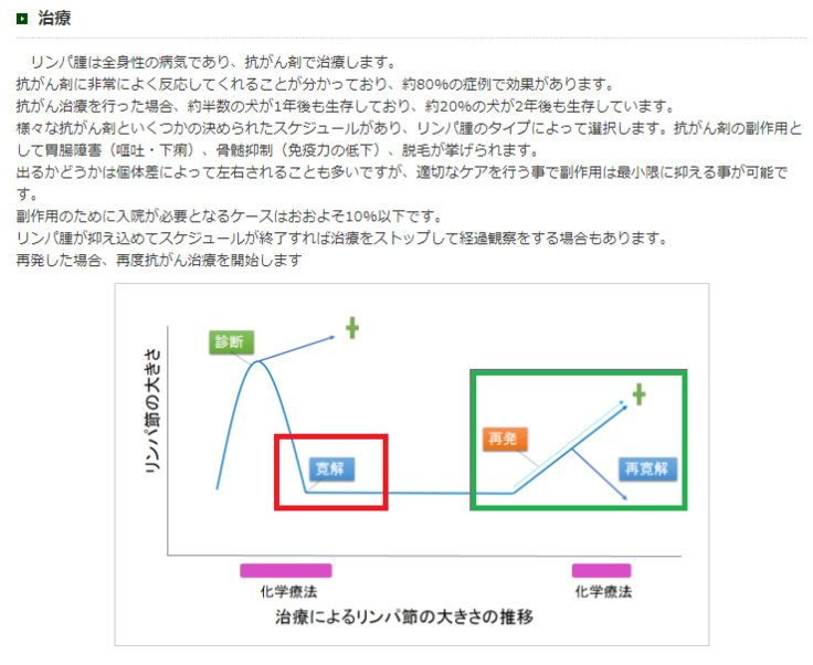 呼吸困難は多中心型リンパ腫が根本の原因ですが、そのリンパ腫増殖を抑えるためには複数の抗がん剤による原因となるリンパ細胞の減少と、再増殖するリンパ細胞の増殖スピードを低下させる必要があります。