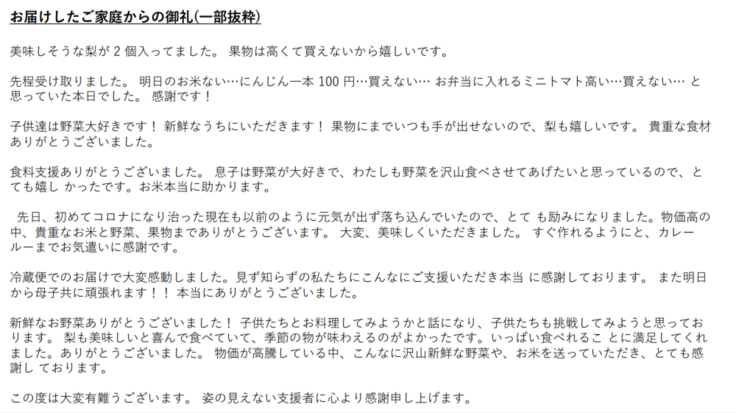 お届けしたご家庭から50以上のお声をいただきました。嬉しいお言葉の他、昨今の物価高、いまだ終息しないコロナでの仕事難、ひとり親家庭のご苦労など、生活がひっ迫している状況も読み取れ、非常に苦しい中日々過ごされている様子が伺えました。
