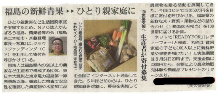 私たち、NPO法人がんばろう福島 農業者等の会は、皆様から沢山の応援とご寄付をいただき、2023年8月24日に50万円の目標を達成後、翌月9月末迄に100世帯の生活困窮家庭へ新鮮な農産物をお届けすることができました。誠にありがとうございました。